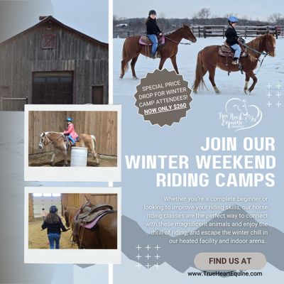 A laid back weekend horse activity for ALL AGES. This camp is for beginner and novice riders all the way through advanced riders who are interested in horses but haven’t yet committed to weekly riding lessons (or cannot do weekday classes). The program runs for 4 weeks on Saturdays in December 2025, January 2026, and February 2026 (Please pay attention to what times you sign up for, as there are different groups!) At our HEATED facility!